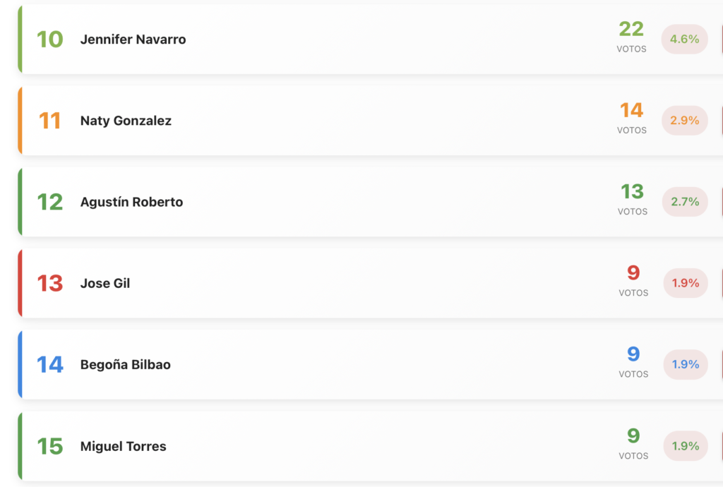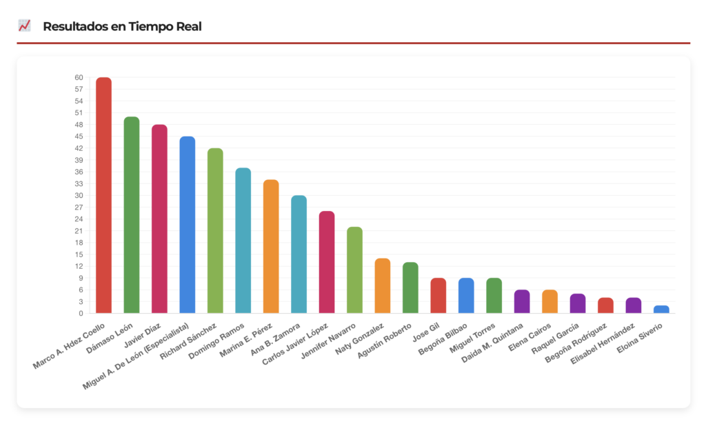 El gráfico muestra la distribución de votos, destacando un claro consenso en las primeras posiciones y una participación muy repartida entre todos los postulantes.