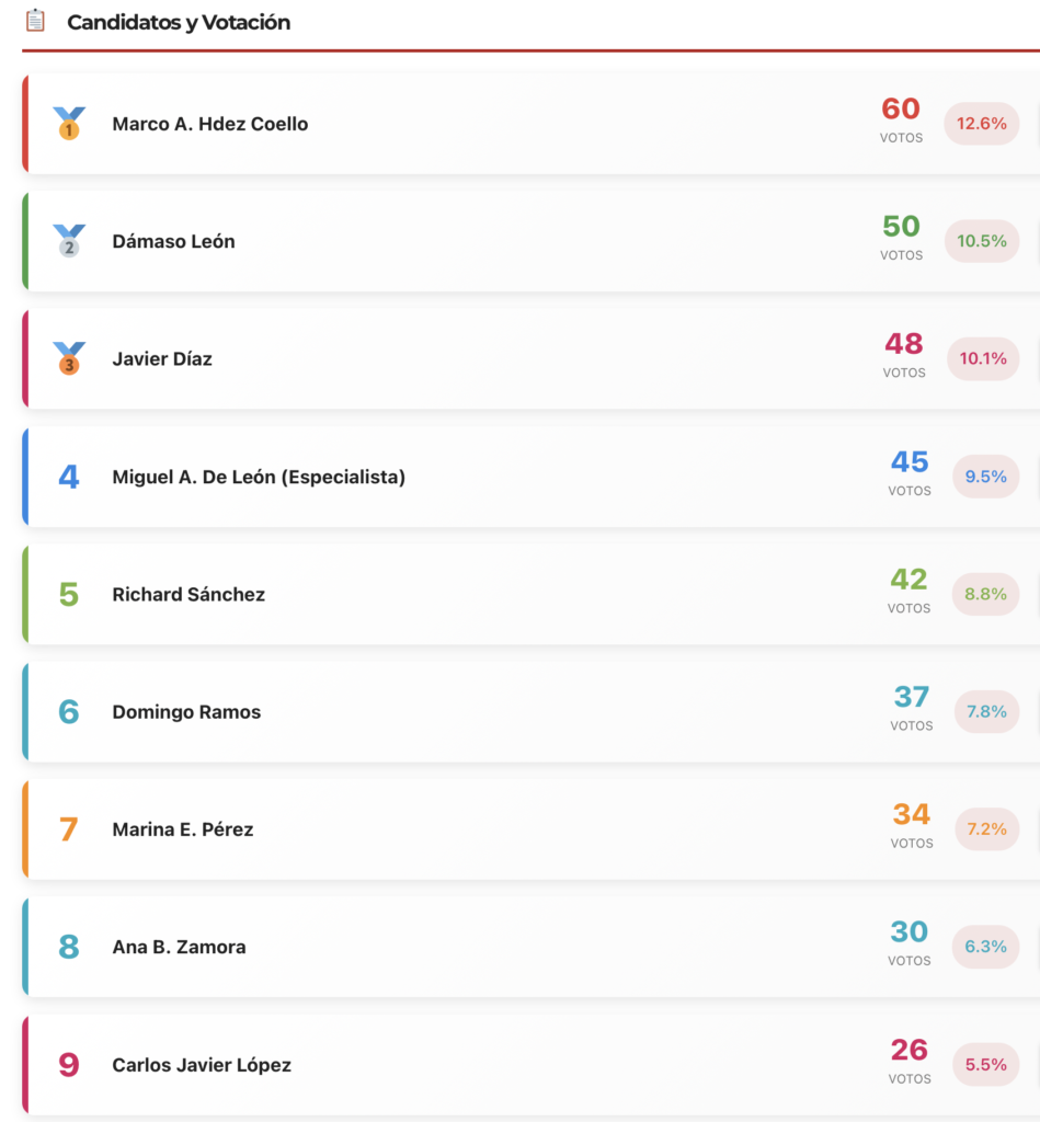 - Miguel A. De León (Especialista) – 45 votos (9.5%)